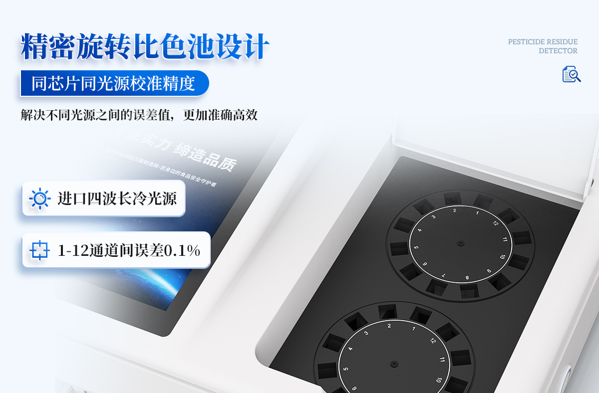 | 1. 仪器采用台式一体化系统检测技术,新型农残检测模块、数字化管理模块、无线通讯模块高度集成于一体,同时预留升级检测方法。 | 2. 仪器检测模块标准化、智能化,可随意自由组合。检测箱体内置多个标准检测单元,检测模块可以调整配置。 | 3. 仪器采用全新安卓智能系统,主控芯片采用 ARM Cortex-A7,RK3288/4核处理器,10.1寸高清液晶触摸竖屏,更加流畅的UI交互界面,运转快捷;仪器配备无线通信模块: 4G(APN)通讯模块、Wifi模块,蓝牙传输,同时具有双USB接口以及RJ45接口能以多种方式实现数据保存和数据传输功能。 | 4. 创新检测模式: 检测通道:≥24通道;采用精密旋转比色池设计,使用同芯片同光源校准精度,解决不同光源之间的误差值。1-12通道间误差0.1%。(**号:ZL202022821055.2) 仪器具有自动识别比色皿检测功能,即:将样品比色皿放入仪器后,点击样品检测,仪器自动识别比色皿进行通道检测。 | 5. 进口高精光源: 高精度进口四波长冷光源,通道配置 410、520、590、630nm 波长光源,一个光源芯片驱动一个光源,误差极小,每台设备单独校准光源,准确比对,同时参照四种不同波段光源全方位覆盖市面上99%的农残食品项目检测,可按照实际需求进行食品项目检测升级。 |