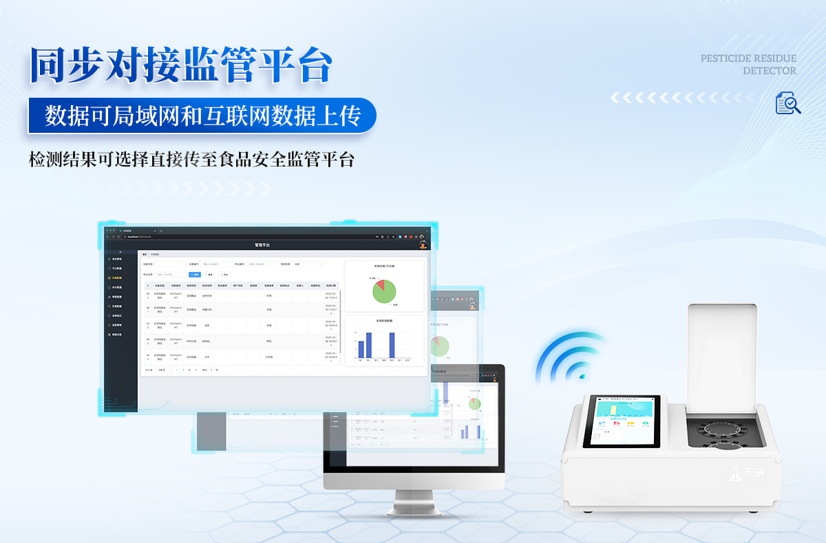 6. 智能操作分析系统: 6.1.便捷操作系统:设备检测时可在同一检测界面自动对应相关检测通道一次性选择1-24个样品名称,无须退出界面,节省操作时间。 6.2.数据集成系统:设备首页自动统计检测数据包含:周检测数据、月检测数据,全部检测总数量,均包含检测总数,合格数,不合格数,以及相关柱形分析图,对各项检测数据清晰掌握,无需电脑查询,更加快捷直观。 6.3.项目预设系统:支持添加单个及多个相同或不相同的任务预设,一键快速调取,每一个任务分别可以设置不同的样品、批次、编号、来源、备注、抽样信息、检测信息、受检信息、复核信息等更多信息。 6.4.数据监管系统:同步对接监管平台,数据可局域网和互联网数据上传,检测结果可选择直接传至食品安全监管平台。集成OSS输出存储服务、区分设备定向管理应用,进行区域食品安全监管及大数据分析处理与数据统计,检测区域食品安全长短期动态,达到食品安全问题预估、预警。 6.5.自定义打印系统:内置新创自定义打印系统,可按需灵活设置开启或关闭:产品合格证(国家农业部标准),二维码,抽样信息、检测信息,受检信息、复核信息、抽样日期、检测日期等信息的打印。 6.6.A4版本报告打印功能:设备可自动生成A4版报告,外接打印机即可打印 6.7.系统远程更新功能:可定向分客户分仪器更新系统,按照不同客户后期实际需求添加项目,无需设备返厂,即可远程实时升级全新系统,节省时间成本及避免运输造成设备损坏。 |